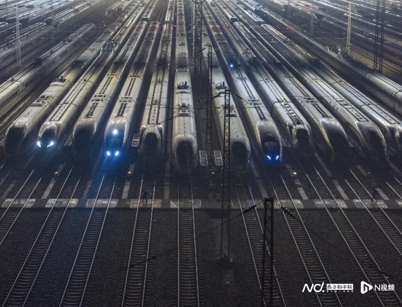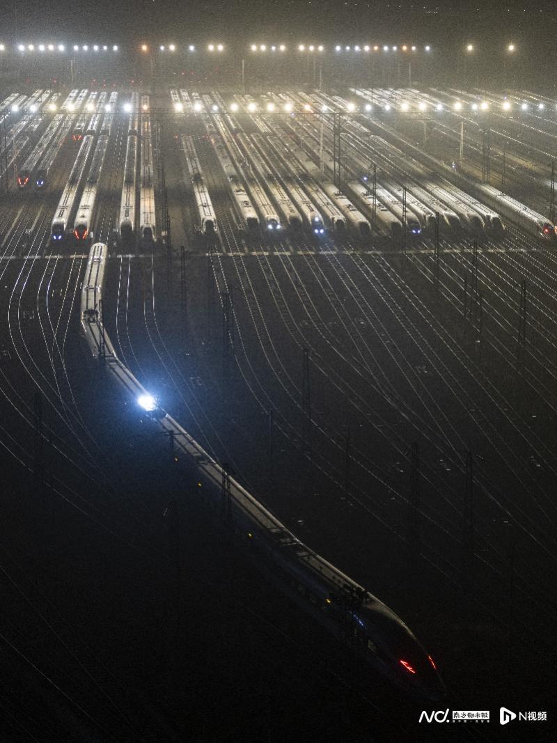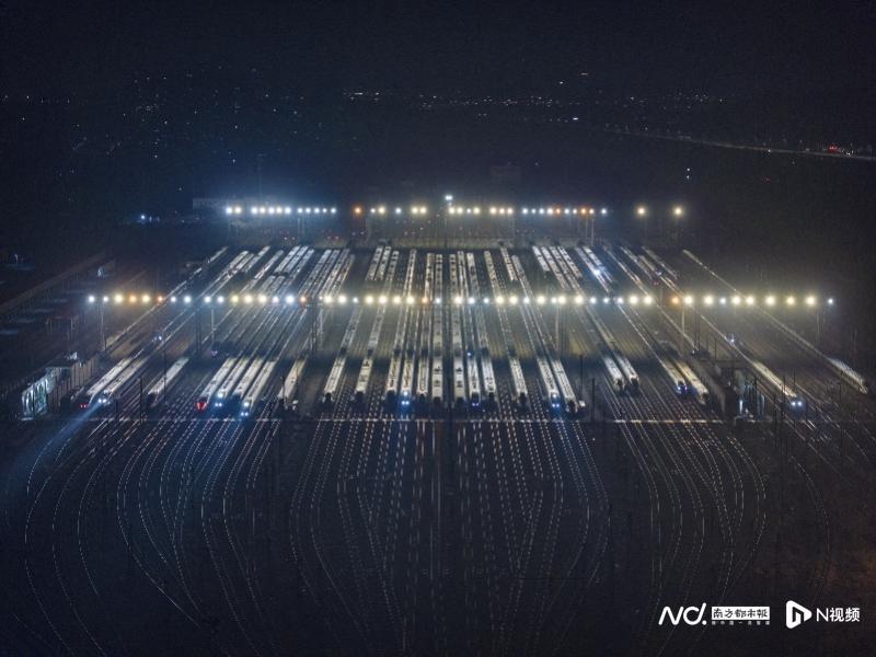 2026年2月4日23时54分,广州动车段广州南动车运用所内灯火通明,一列列动车组停放在检修轨道上。