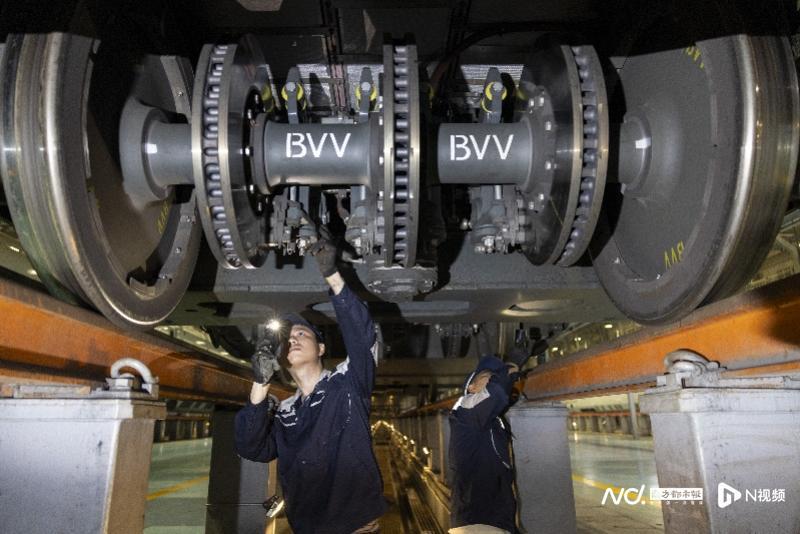 这里的工作节奏,可以说是整个春运的缩影。深夜至凌晨,当每天最后一列动车组返回检修库,检修人员立即开始工作,争分夺秒。机械师们或俯身地沟细致排查,或穿梭车厢逐一检查,对动车组走行部件、受电弓高压部件及车内旅客服务设施等关键部位进行全面检测、精细维修。