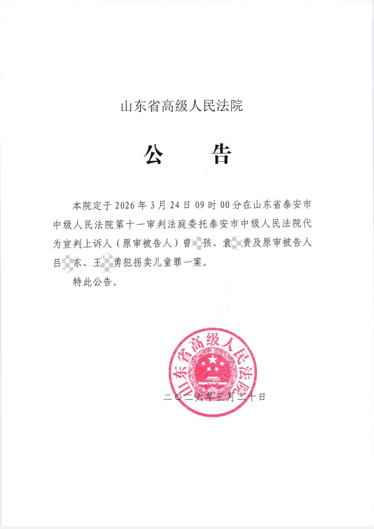 南都此前报道,2025年9月19日,“四人入室抢婴贩卖案”在山东省泰安市中级人民法院一审宣判。法院以拐卖儿童罪,分别判处被告人曾某孩死刑,缓期二年执行,剥夺政治权利终身,并处没收个人全部财产;被告人吕某东、王某勇无期徒刑,剥夺政治权利终身,并处没收个人全部财产;被告人袁某贵有期徒刑十五年,并处罚金人民币一万元;依法支持附带民事诉讼原告人(姜甲儒父母)诉讼请求人民币20万元。